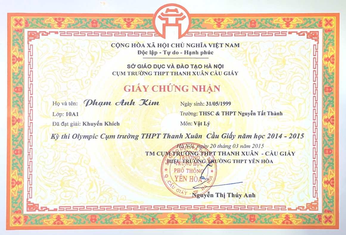 Giải khuyến khích học sinh giỏi Vật lý cấp Quận (2015 & 2016) (certificate)