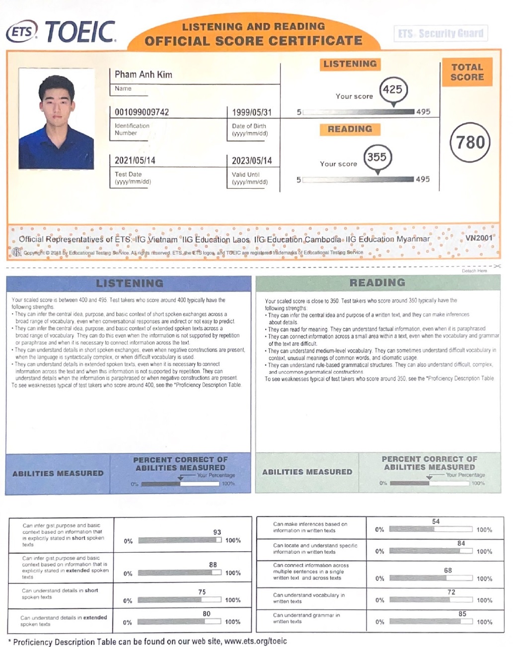Tiếng Anh (780 TOEIC & đạt điều kiện ra trường ~ quy đổi tương đương 6.5 IELTS)